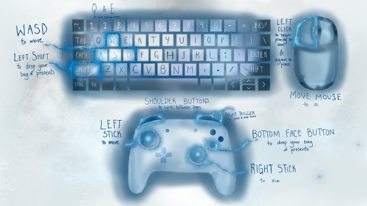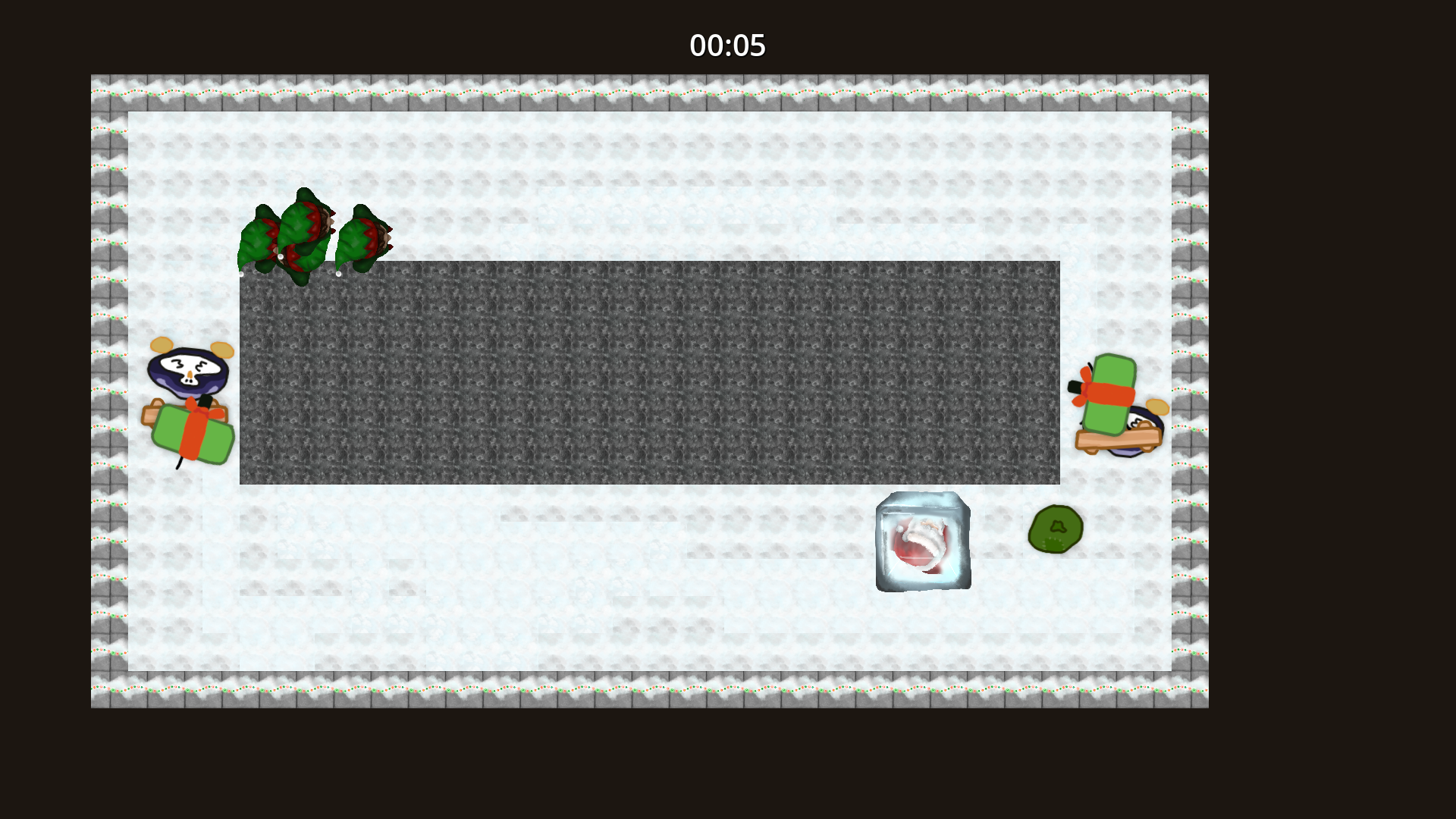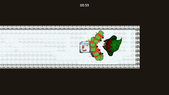 Zombie elves are invading Santa's workshop. At the beginning of each level, the elves are frozen, and you have a few seconds to move around, place your bag of presents, collect items, and build a base to protect the gifts. When you move close to a collectible item, it is added to your inventory, and you can place it. Once your time is up, you will freeze, and the elves will try to steal your presents. If you hold them off long enough, you can move on to the next level.